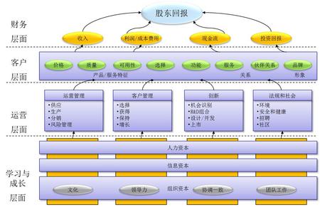 这是战略目标梳理的整体思考路径,包括四个层面。首先看财务层面,财务层面强调的是股东价值,就是股东怎么看待企业,股东要求的回报是什么?通常会表现为利润增长、EVA(经济增加值)等;第二个是客户层面,企业的财务收入是谁带来的?是客户。客户层面强调的是企业如何满足客户需求,如何做到客户满意,产生持续购买和新的购买,从而为企业带来业务收入;第三个是内部流程层面,强调的是内部流程如何完善才能保障我们服务客户、满足客户需求的能力;第四个是学习与成长层面,这个层面强调的无形价值,主要包括人力资本,人的能力如何提升才能保障上述三个层面的实现,信息资本,使用什么信息系统保障快捷沟通,提升沟通效率?组织资本,组织氛围如何改善?