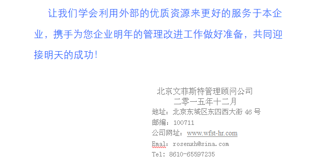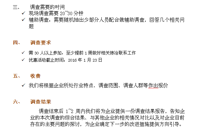 时值岁末各单位的人力部门又开始准备年底的总结、评价工作了,而作为一项人力资源管理的客观测量工具的员工满意度调查是普遍被企业所采取的“体察民情”的方式,因为它可以便于管理者在时间、物力成本都付出不大的情况下以简便的方式获得一手的员工反馈信息,故而被企业广泛采纳!本次调查活动是文菲斯特公司旨在为各界客户总结即将逝去一年的工作,准确定位来年的工作目标而开展的,为感谢以往客户的大力支持特为此次活动准备了每周10个优惠名额:对在12月30日前报名的企业有资格享受7.5折的优惠价格,欢迎大家尽快报名抢占这些有限的名额噢!
